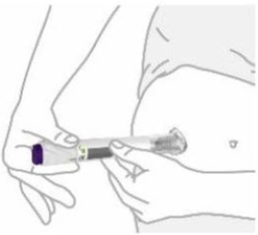 ステップ3|注射する 紫色の注射ボタンを押し続け、皮膚に対して一定の圧を保ったまま(弱めないでください)、少なくとも10秒間押し続けてください。 最初のクリック音と2回目のクリック音の両方を確認してから、ペンを皮膚から離してください。 |